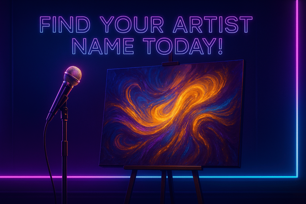 “Futuristic digital screen showing an artist typing their name, glowing results with unique names appearing in bold letters. Overlay text: ‘Generate Your Artist Name →’ in a modern button-style design. Bright colors, clean composition, optimized for call-to-action.”